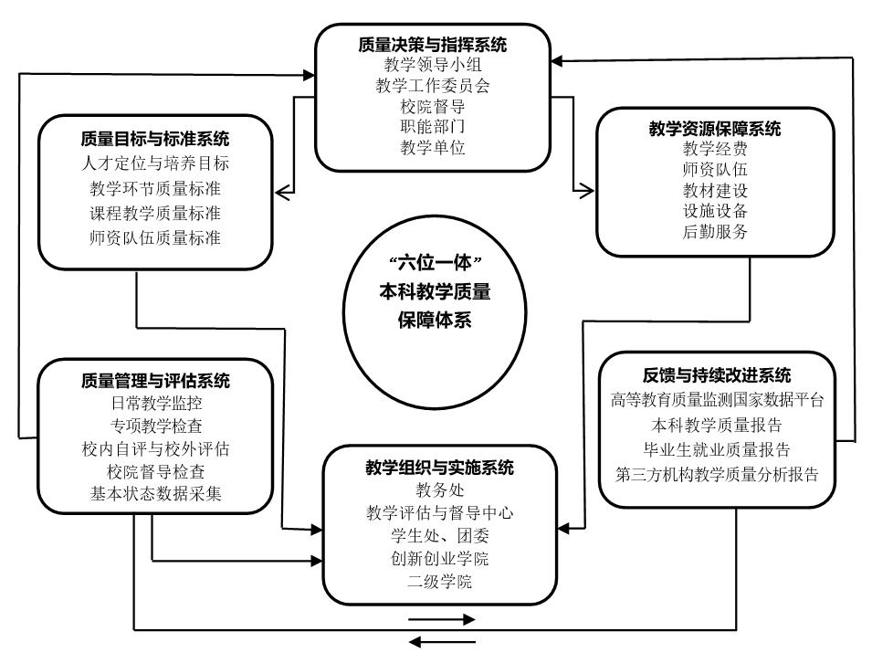根据学校“建设特色鲜明的高水平应用型大学”的发展目标,围绕“素质为魂,能力为本,崇尚创新”的人才培养理念,遵循教育教学工作基本规律,立足常态,着眼长远,充分发挥学院、教师和学生在教学质量保障和提高中的主体地位,进一步完善由质量决策与指挥系统、质量目标与标准系统、教学组织与实施系统、质量管理与评估系统、反馈与持续改进系统、教学资源保障系统的“六位一体”本科教学质量保障体系。